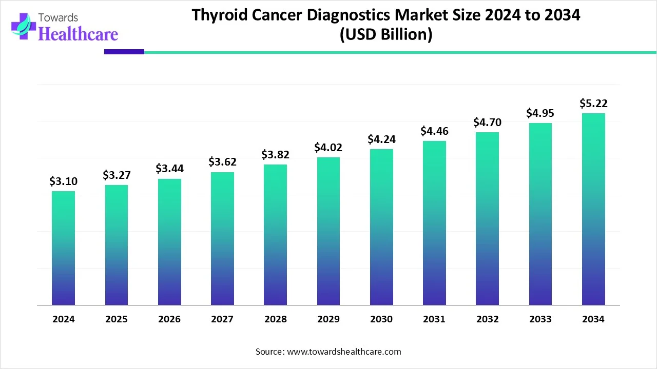 Ottawa, Oct. 06, 2025 (GLOBE NEWSWIRE) -- The global thyroid cancer diagnostics market size was valued at USD 3.10 billion in 2024 and is predicted to hit around USD 5.22 billion by 2034, rising at a 5.34% CAGR, a study published by Towards Healthcare a sister firm of Precedence Research.